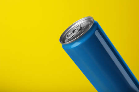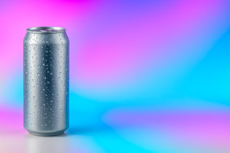 A bright aluminum can against a soft colored background, close-up highlighting the details and texture of the packaging.