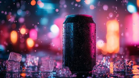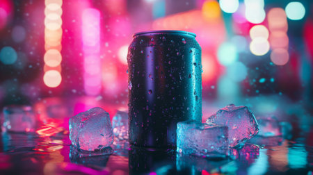 A cold can of soda sits on a surface with ice cubes, surrounded by colorful lights