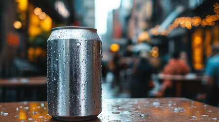 A cold, refreshing can sitting on a table in a bustling city alley on a rainy afternoon