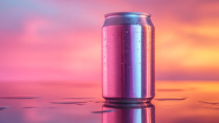 Metal can reflects colorful sunset hues on water surface with droplets in a serene outdoor setting during evening hours. Generative AI