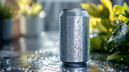 Refreshing beverage can with condensation surrounded by greenery in a bright and vibrant environment. Generative AI