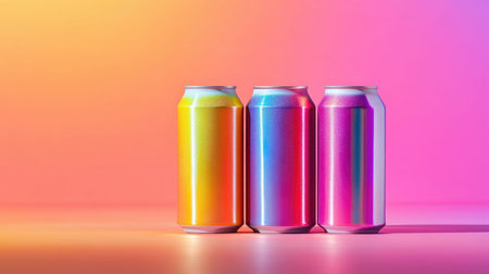A stunning arrangement of metallic beverage cans in vibrant colors against a soft gradient background, showcasing a modern and artistic aesthetic perfect for refreshment themes.