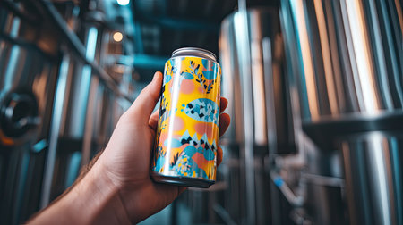 A hand holding a can of craft beer with a modern, colorful label in a brewery setting.
