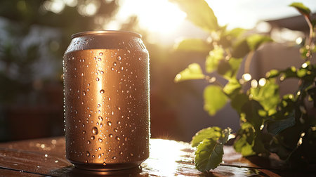 A stunning close-up of a metallic beverage can glistening with water droplets in warm sunlight. The natural greenery in the background enhances the refreshing vibe.