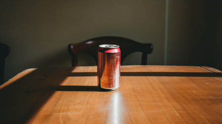 a can of red bull, captured with the carl zeiss distagon t 15mm f2.8 ze lens, is placed on a rustic wooden table. the photograph, taken using provia film, showcases a minimalist and simplistic style. the creased texture of the can adds character, while the canon af35m camera captures the light amber and crimson hues. ai generated
