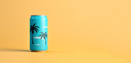 Jar with palm tree on yellow background. Banner for design with copy space. Can with soda template. AI generation.