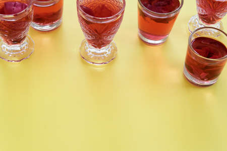 Red alcoholic shot drinks in glasses in a row on the bar count. Restaurant menu.