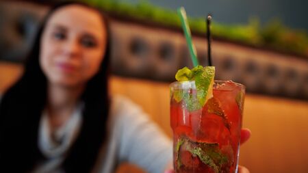 Christmas drink red non-alcoholic mulled wine with a straw on the background of the cafe interior, order for one