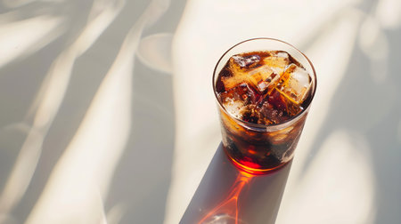 Dark Brown Summer Drink on a light Background with Sunlight and Shadows
