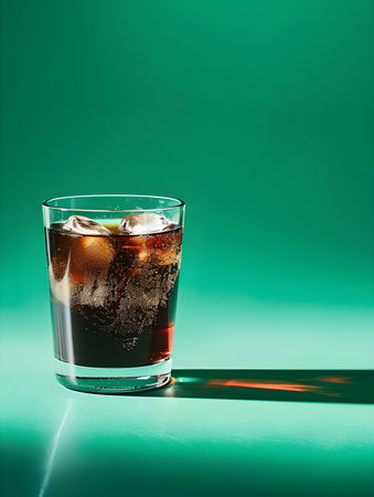Dark Brown Summer Drink on a green Background with Sunlight and Shadows