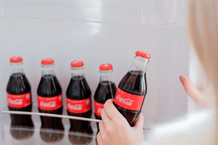 Kharkiv, Ukraine - November 8, 2018: Coca Cola in glass bottles in fridge