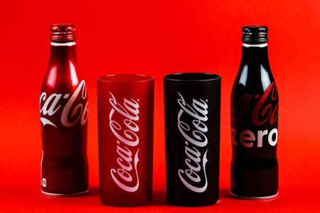 Atlanta, Georgia, USA April 1, 2020: red aluminum contour bottle of coca-cola and black aluminum contour bottle of Coca-cola zero and plastic glasses isolated on red background
