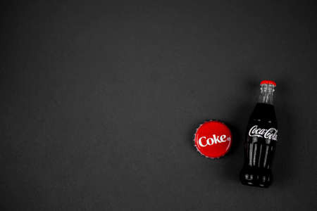 Atlanta, Georgia, USA April 1, 2020: closeup of coca cola toy bottle and red cap of Coca-Cola bottle isolated on black background