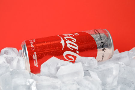 MYKOLAIV, UKRAINE - NOVEMBER 15, 2018: Coca Cola can on ice cubes against color background