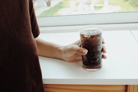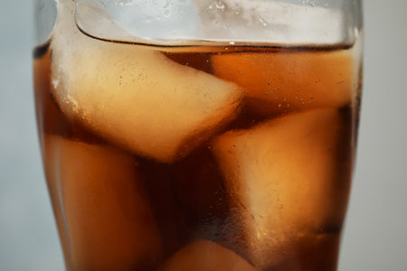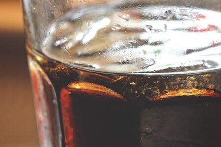 A glass of soda with ice cubes. Chilled drink in a glass.