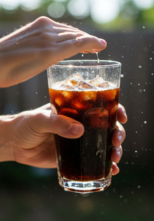 A close-up view of bubbles splashing in a fizzy brown beverage with an energetic vibe