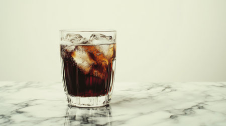 A minimalistic shot of a glass of Coke on a marble countertop, with elegant lighting creating reflections and highlighting the drink's rich color and carbonation.