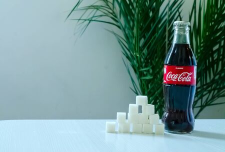 Kazakhstan Almaty, October 18, 2019. A bottle of Coca-Cola stands on a table with refined sugar cubes on a light background and a green plant.