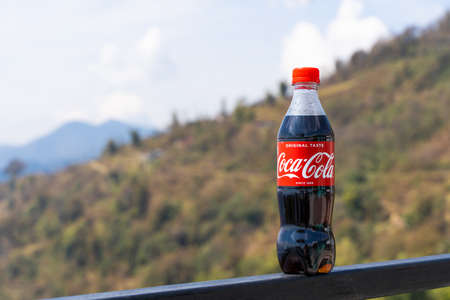 Nepal, Pokhara, Sarangkot village - March 2020: Coca Cola bottle with a beautiful mountain view on background.