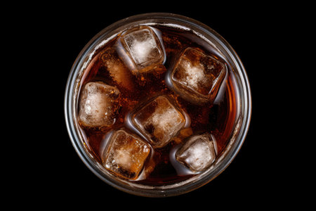 Fizz sparkling cola water refreshing bubbly soda pop with Ice cubes. Glass of cola on black background closeup.