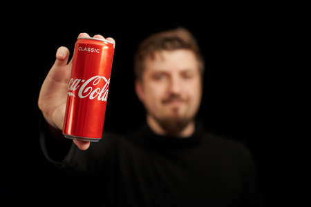 KALININGRAD, RUSSIA - MARCH 13, 2021 - Young guy with Coca Cola can in hand, black background. Classic coke jar, carbonated soft drink. Manufactured by The Coca-Cola Company.