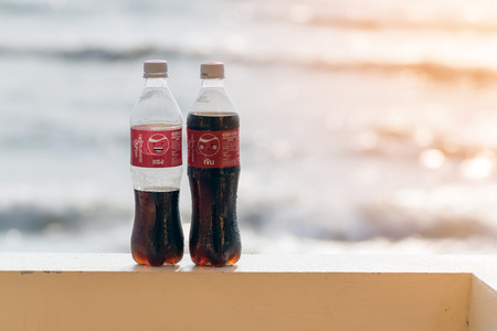 Chon Buri,Thailand-Feb 22,2016:Coke in a bottle is placed on a terrace near the sea in the morning with beautiful sunrise.