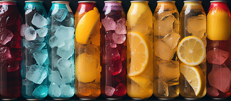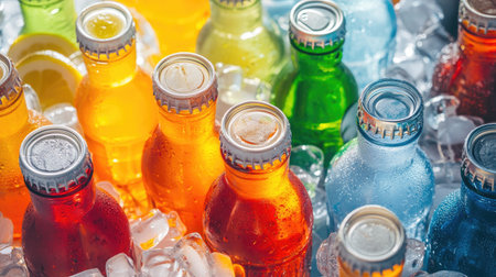 This captivating image features a vibrant collection of beverage bottles nestled among ice cubes, radiating freshness and color, perfect for summer gatherings.