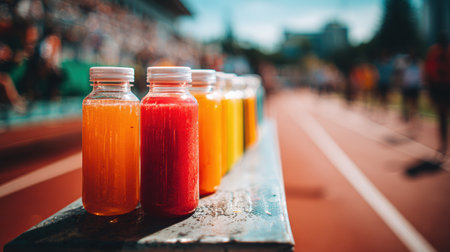 Hydration drinks in colorful bottles sit on a metal podium, sunlight shining brightly as athletes compete in the background on a track field.