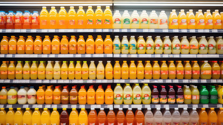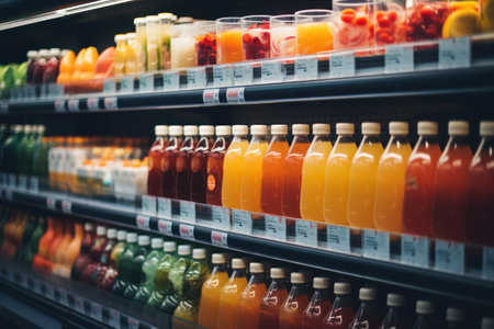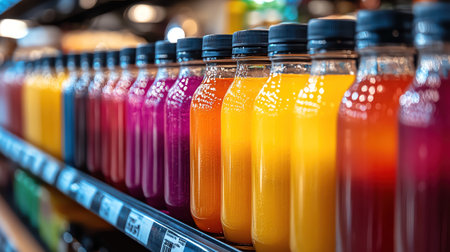 Brightly colored juice bottles lined up on a grocery store shelf