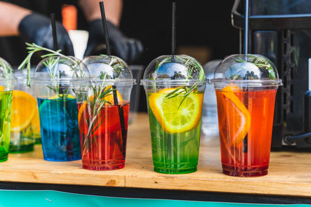 Colorful beverages in clear cups with fruit garnishes and herbs displayed on a wooden table at an outdoor event, showcasing refreshing drink options for summer gatherings