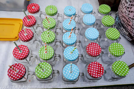 Refreshing Brown Soda in bottles in Candy Bar On Table. Delicious sweet buffet.