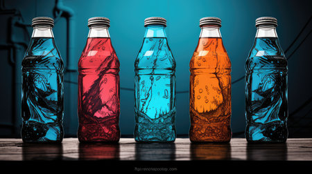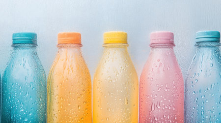 Five colorful bottles filled with refreshing beverages display a vibrant aesthetic. Each bottle is adorned with water droplets, enhancing their appeal.