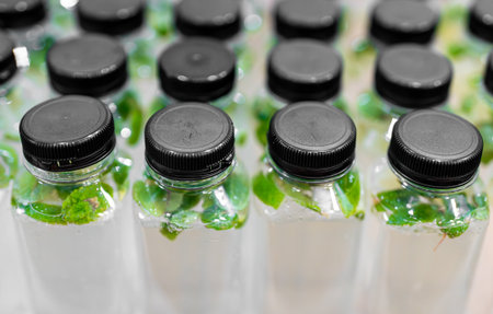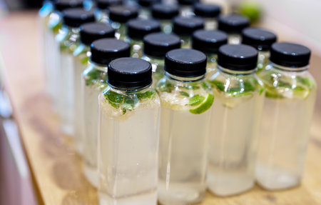 Plastic bottles filled with sparkling lime mint water.