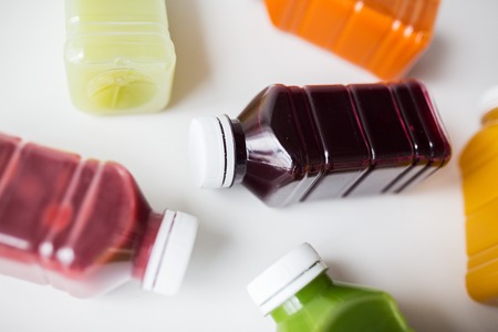 healthy eating, drinks, diet and detox concept - close up of plastic bottles with different fruit or vegetable juices on white