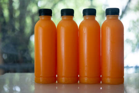 Four bottle of fresh orange juice with black lid against nature background
