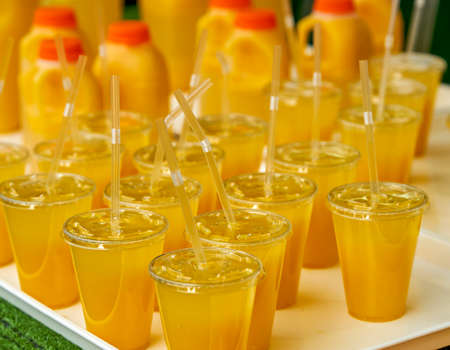 Tray with fresh squeezed juices in plastic cups with straws.