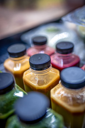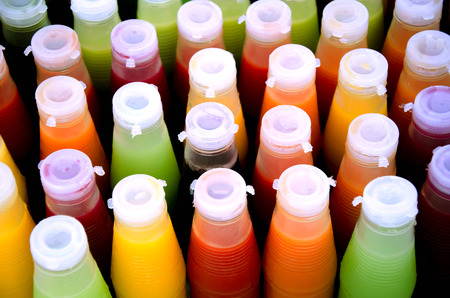 Assortment of cold tropical fruit juice in bottles