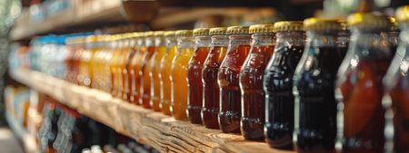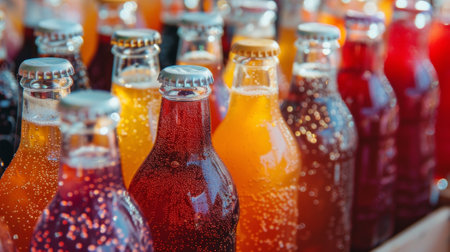 A vibrant display of colorful bottles filled with various drinks in a market setting, showcasing refreshing beverages perfect for summer enjoyment.