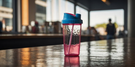 AI Generated. An angled view of a brightly colored plastic reusable bottle with a secure screwon cap and a clear straw perfect for sipping onthego
