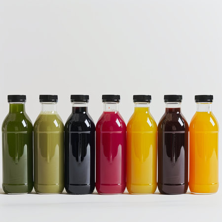 colorful fruit and berry juices in glass bottles generative ai.