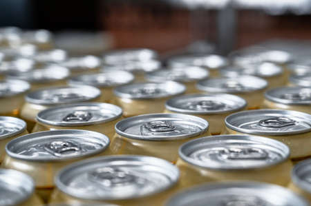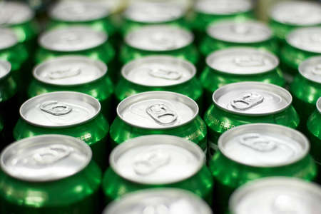 Many metal cans with cool drinks. A group of objects. Beverages