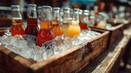 A vibrant display of assorted vintage glass bottles resting in a rustic wooden crate filled with ice, perfect for summer gatherings and outdoor events.