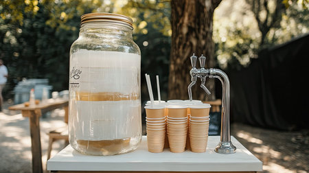 A clear glass jar filled with a refreshing beverage sits next to stacks of cups and a stylish drink dispenser, set outdoors in a vibrant natural environment.
