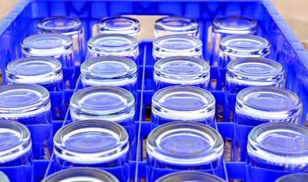 Selective focus, Empty water glasses arranged in blue plastic box