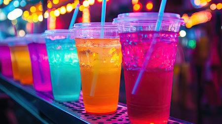 Italian sodas in plastic cups with bright neon colors under colorful lights at a night market