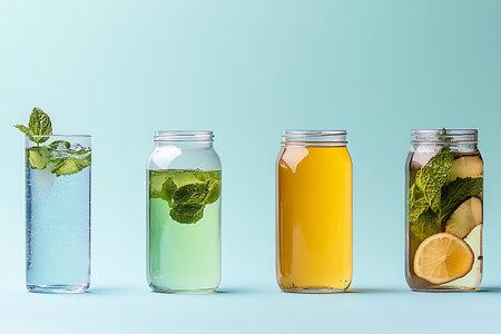 An arrangement of colorful beverage bottles lined up against a textured light blue wall with sunlight casting soft shadows. The minimalist style and vibrant colors are ideal for drink, lifestyle, and refreshment themes.