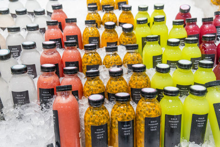 Colorful cold pressed juices in bottles displayed on crushed ice in supermarket shelf. Healthy tropical fruit juice, chilled beverages ready for purchase in grocery store in Thailand. Drink retail