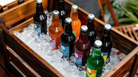 A vibrant display of colorful bottled beverages nestled in a wooden crate filled with ice. Ideal for summer gatherings or refreshing moments outdoors.