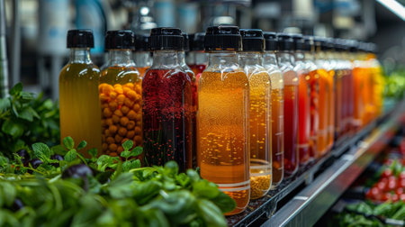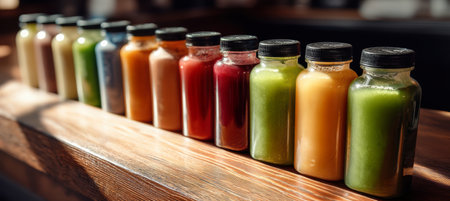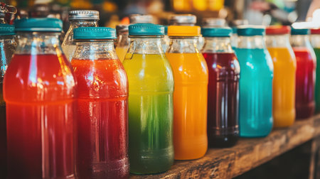 A vibrant collection of colorful juices in glass bottles offers a refreshing visual delight, showcasing the essence of healthy beverages in a rustic setting perfect for summer enjoyment.