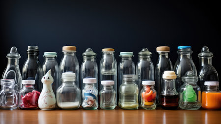 Plastic bottles of different colors and sizes on a black background.